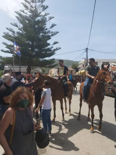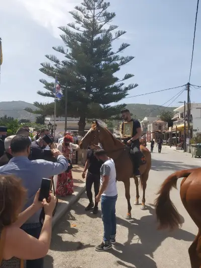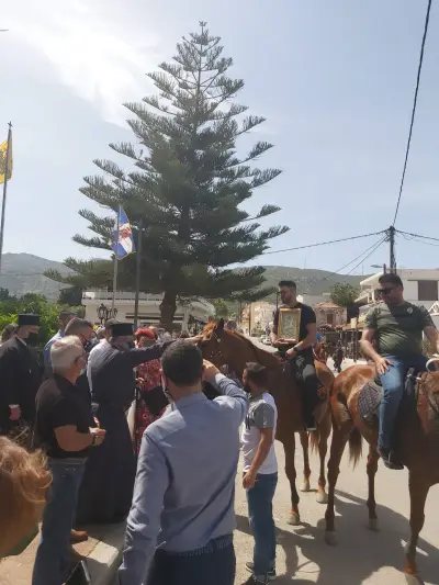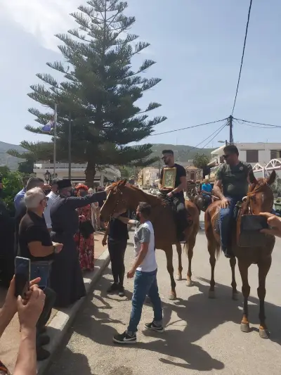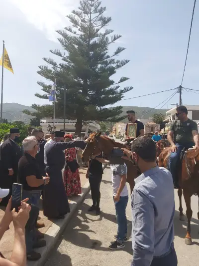 Ο Σεβασμιώτατος Μητροπολίτης Κώου και Νισύρου κ. Ναθαναήλ μετά το πέρας της παρέλασης των αλόγων έδωσε την ευχή του στους αναβάτες, σπάζοντας μάλιστα και το καθιερωμένο αυγό στο κεφάλι του αλόγου που μετέφερε την εικόνα του Αγίου Γεωργίου.