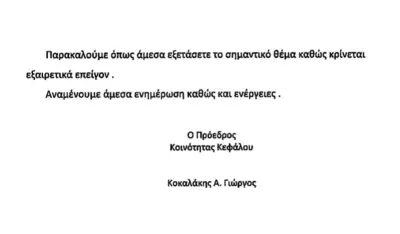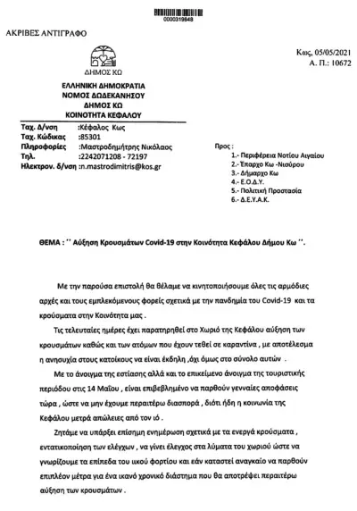 Επιστολή του Προέδρου της Κοινότητας Κεφάλου, σχετικά με την αύξηση των κρουσμάτων COVID-19 στην κοινότητα