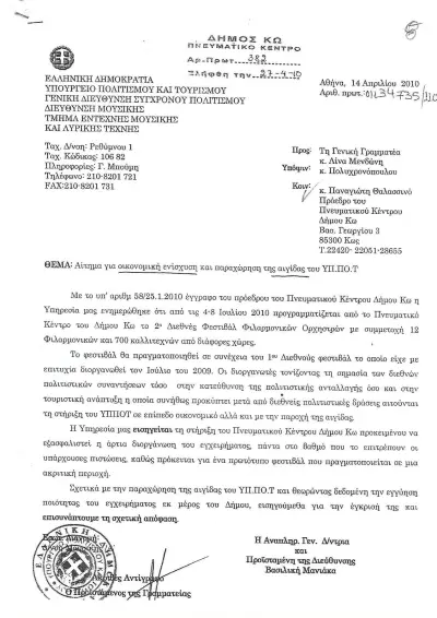Επίσης θα πρέπει να γνωρίζετε ότι το 2010 μετά από τηλεφωνική επικοινωνία με την κα. Μανιάκα εστάλη έγγραφο στο Υπουργείο Πολιτισμού στο τμήμα Μουσικής & Τέχνης 25-1-2010 αρ.πρωτ.58 (σας το παραθέτω Νo 7) ζητώντας οικονομική ενίσχυση και να τελέσει υπό την αιγίδα του Υπουργείου Πολιτισμού. Στις 27- 4 -2010 λάβαμε την απάντηση που σας παραθέτω στο Νo 8. Όπου εν τέλει παρά την δεδομένη θετική γνωμοδότηση και πρόθεση από πλευράς του ΥΠΠΟΑ, δεν λάβαμε ποτέ καμία επιχορήγηση. Αξίζει σε αυτό το σημείο να σημειωθεί, ότι το εν λόγω πρόγραμμα επιχορηγήσεων για όσους γνωρίζουν, δεν δίνεται για 1η φορά φέτος, αλλά δίνεται εδώ και αρκετά χρόνια από το αρμόδιο Υπουργείο και επί της δικής σας θητείας όλα τα προηγούμενα έτη, ουδέποτε λάβαμε καμία επιχορήγηση.