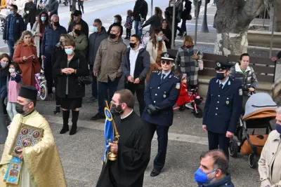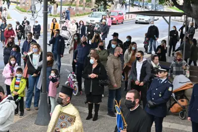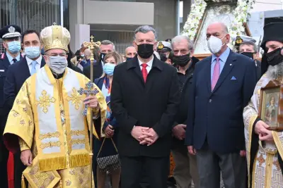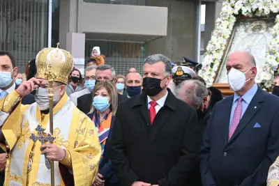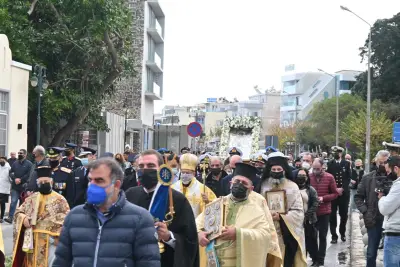 Η λιτάνευση της εικόνας ξεκίνησε από τον Άγιο Νικόλαο, καθώς η πομπή κατευθύνθηκε προς τον Ιερό Μητροπολιτικό Ναό του Αγίου Νικολάου όπου και εψάλη Δέηση μπροστά στον Ναό.