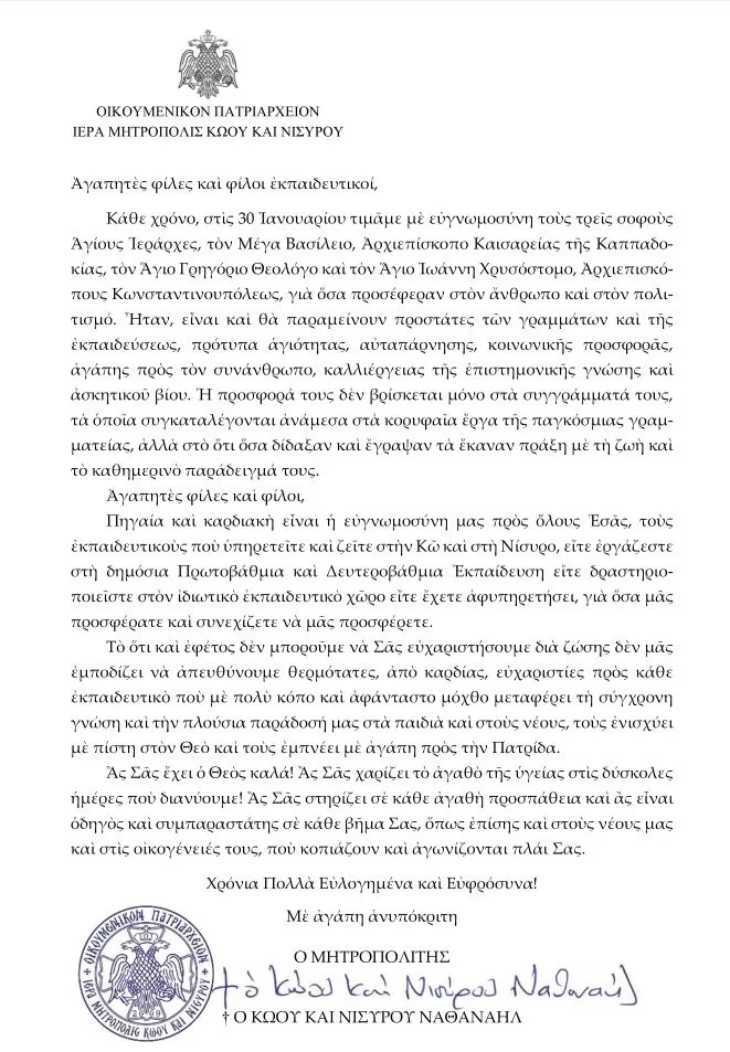 Ὁ Σεβασμιώτατος Μητροπολίτης Κώου καὶ Νισύρου κ. Ναθαναήλ, ἀπηύθυνε γιὰ τὴν Ἑορτὴ τῶν Τριῶν Ἱεραρχῶν, προστατῶν τῶν Γραμμάτων καί τῆς Παιδείας, πρός ὅλους τούς Ἐκπαιδευτικούς τῆς Κῶ καὶ τῆς Νισύρου τὴν ἀκόλουθη ἐπιστολή: