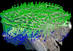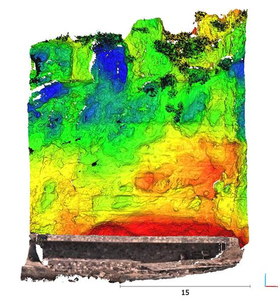 Εικόνα 4. Τρισδιάστατη αποτύπωση περιοχής έρευνας με επίγειο LiDAR και επεξεργασία νέφων σημείων για τον καθορισμό των επισφαλών περιοχών προς στήριξη.