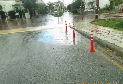 ---Παραμονές Χριστουγέννων έγινε παρέμβαση από τον Δήμο μας στην διασταύρωση Παπαθεοφάνους και Παπαναστασίου στην έξοδο από το 1ο Γυμνάσιο για την προστασία μαθητών και διερχομένων. Και εδώ μπορεί να λύνεται εν μέρει ένα πρόβλημα άλλα δημιουργείται ένα άλλο πρόβλημα! Προφανώς κάπου υστερεί η μελέτη! Πιστεύουμε ότι δεν χρειαζόταν αυτού του τύπου η τεχνική λύση διότι είναι πολυδάπανη, κακότεχνη και επικίνδυνη. Θ α μπορούσε να επιλεγεί μια πιο απλή λύση όπως πχ η τοποθέτηση στα 4τις 4 κάθετες διαβάσεις πλαστικά καμαράκια με την κατάλληλη οριζόντια και κατακόρυφη σήμανση . η απορροή των ομβρίων θα γινόταν όπως και πριν και να μην λιμνάζουν όπως γίνεται σήμερα (φωτό 3)