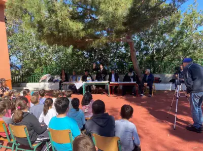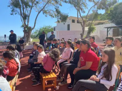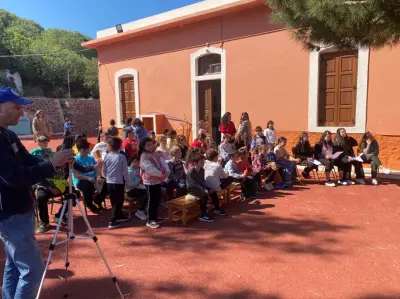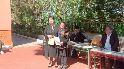 Η Ανδρομάχη Διαμαντοπούλου μαζί με την διευθύντρια του Δημοτικού Σχολείου Ιωάννα Κατσιπόδη και τους διδασκάλους και τους μαθητές