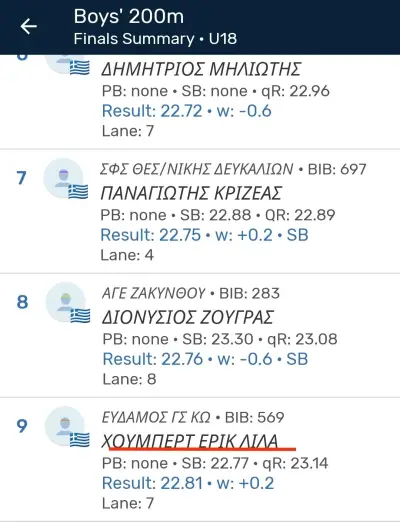 Επίσης στη δεύτερη μέρα του πανελληνίου πρωταθλήματος Κ18 , έλαβε μέρος στα 200μ και μέσα από 90 συμμετοχές διακρίθηκε στην 9η θέση με χρόνο 22'81".