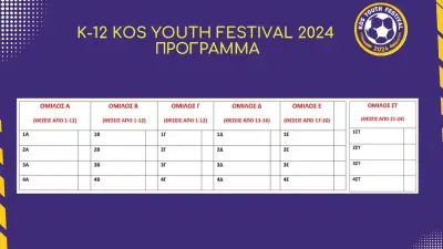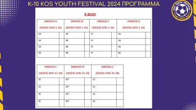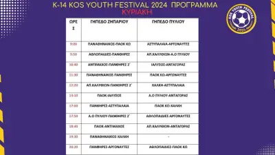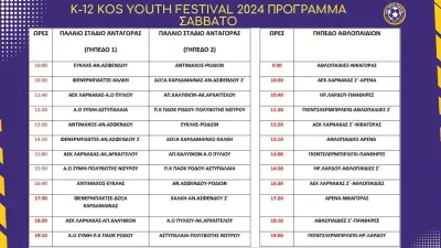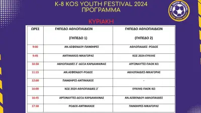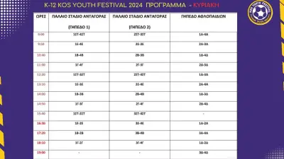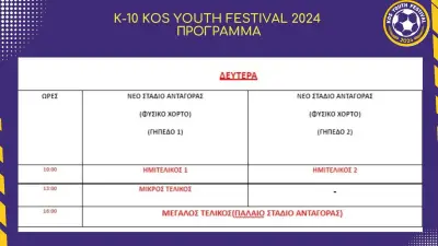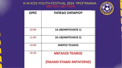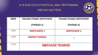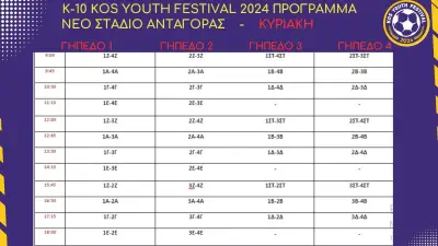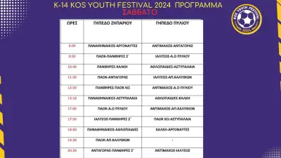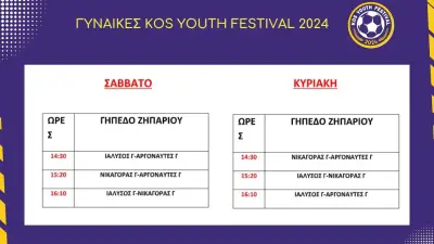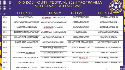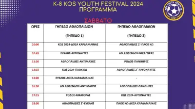 Ανακοινώθηκε απ’ τους διοργανωτές το πρόγραμμα του 3oυ Kos Youth Festival που θα διεξαχθεί στο νησί μας απ’ τις 27 έως τις 29 Απριλίου στις ηλικιακές κατηγορίες Κ-8, Κ-10, Κ-12 και Κ-14 και για το γυναικείο τμήμα.