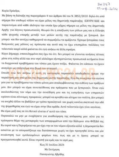 Η επιστολή ανεξαρτητοποίησης του Παναγιώτη Αβρίθη από τη Δημοτική Αρχή