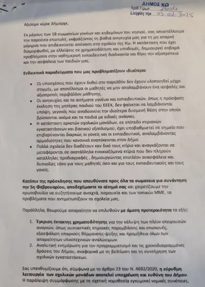 Εκ μέρους των 18 σωματείων γονέων και κηδεμόνων του νησιού, σας αποστέλλουμε την παρούσα επιστολή, εκφράζοντας τη βαθιά ανησυχία μας για τη μη επαρκή μέριμνα που επιδεικνύεται απέναντι στα σχολεία της Κω. Η κατάσταση που έχει διαμορφωθεί, με ελλείψεις σε χρηματοδότηση και υποδομές, δημιουργεί σοβαρά προβλήματα στην καθημερινή εκπαιδευτική διαδικασία και θίγει την αξιοπρέπεια και την ασφάλεια των παιδιών μας.