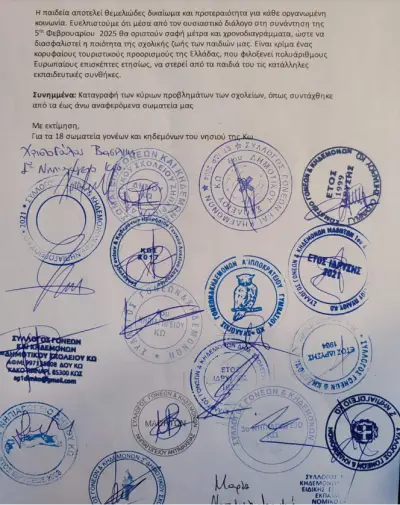 Η παιδεία αποτελεί θεμελιώδες δικαίωμα και προτεραιότητα για κάθε οργανωμένη κοινωνία. Ευελπιστούμε ότι μέσα από τον ουσιαστικό διάλογο στη συνάντηση της 5ης Φεβρουαρίου 2025 θα οριστούν σαφή μέτρα και χρονοδιαγράμματα, ώστε να διασφαλιστεί η ποιότητα της σχολικής ζωής των παιδιών μας. Είναι κρίμα ένας κορυφαίους τουριστικούς προορισμούς της Ελλάδας, που φιλοξενεί πολυάριθμους Ευρωπαίους επισκέπτες ετησίως, να στερεί από τα παιδιά του τις κατάλληλες εκπαιδευτικές συνθήκες.