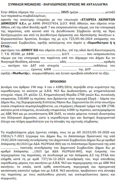 Στην τελευταία συνεδρίαση του Δημοτικού Συμβουλίου Κω που πραγματοποιήθηκε στις 19 Φεβρουαρίου 2025, εγκρίθηκε το σχέδιο σύμβασης παραχώρησης με αντάλλαγμα από την ΕΤΑΔ στο Δήμο Κω, των Α.Β.Κ 963 και Α.Β.Κ 964 Κω Δωδεκανήσου (έκταση Ναυτικού Ομίλου).