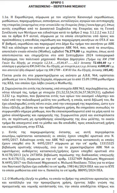 ''Στις 16/12/2024 συνεδρίασε το διοικητικό συμβούλιο της ΕΤΑΔ , έχει ψηφίσει το σχέδιο που έχετε και εσείς στα χέρια σας, οδεύει, αν δεν έχει πάει ήδη στο ελεγκτικό συνέδριο. Εκεί θα σταλεί συμπληρωματικά και η δική μας έγκριση ουσιαστικά απόψε, προκειμένου να προστεθεί στην σύμβαση και να επιστρέψει στην ΕΤΑΔ ούτως ώστε να υπογραφεί από την Διευθύνουσα Σύμβουλο κα Χατζηγεωργίου και τον Δήμαρχο Κω.