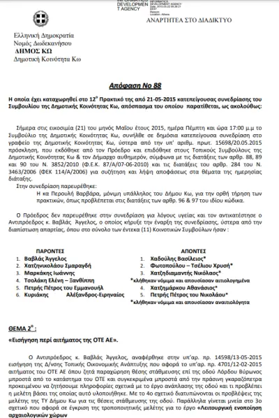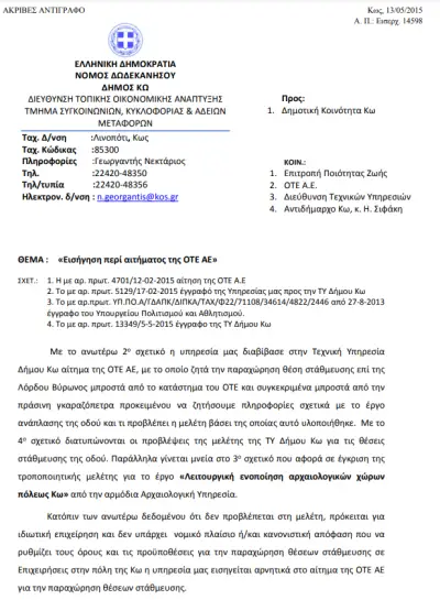 Σύμφωνα με την εισήγηση της Διεύθυνσης Τεχνικών Υπηρεσιών του Δήμου Κω στο κτίριο του ΟΤΕ υπάρχουν τηλεπικοινωνιακές εγκαταστάσεις οι οποίες εξυπηρετούν όλους τους τηλεπικοινωνιακούς παρόχους. Με δεδομένο ότι η θέση θα εξυπηρετήσει αποκλειστικά τις Τεχνικές Υπηρεσίες του ΟΤΕ, η υπηρεσία δήλωσε ότι δεν έχει αντίρρηση για την παραχώρηση της θέσης στάθμευσης.