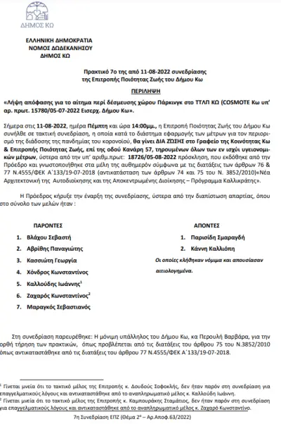 Δείτε παρακάτω στο φωτογραφικό άλμπουμ την αρνητική εισήγηση, για την παραχώρηση της θέσης στάθμευσης, της ΔΙΕΥΘΥΝΣΗΣ ΤΟΠΙΚΗΣ ΟΙΚΟΝΟΜΙΚΗΣ ΑΝΑΠΤΥΞΗΣ ΤΜΗΜΑ ΣΥΓΚΟΙΝΩΝΙΩΝ, ΚΥΚΛΟΦΟΡΙΑΣ & ΑΔΕΙΩΝ ΜΕΤΑΦΟΡΩΝ του Δήμου Κω το 2015, την αρνητική απόφαση της Επιτροπής Ποιότητας Ζωής του Δήμου Κω, για το ίδιο θέμα, στις 11 Αυγούστου του 2022 και την αρνητική απόφαση της Κοινότητας Κω το 2015.