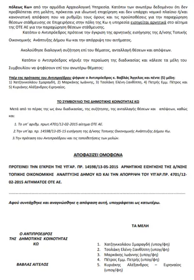 Ο κ. Κοκαλάκης Γεώργιος δήλωσε πως το 2015 το τμήμα Συγκοινωνιών της Διεύθυνσης Τοπικής Ανάπτυξης του Δήμου δεν είχε εγκρίνει το συγκεκριμένο αίτημα του ΟΤΕ, καθώς δεν πρόκειται για κρατική επιχείρηση πλέον και αναρωτήθηκε γιατί τώρα με εισήγηση των Τ.Υ. του Δήμου προτείνεται να εγκριθεί.