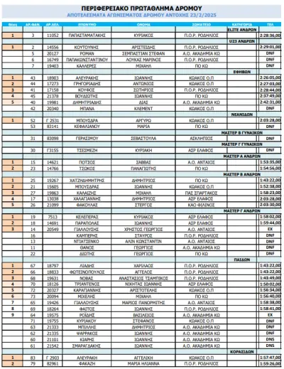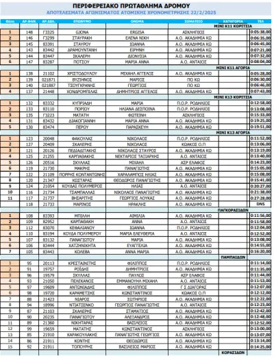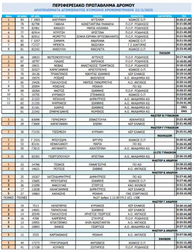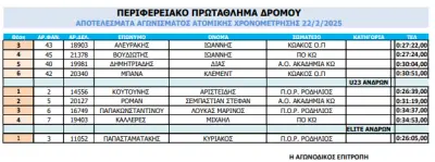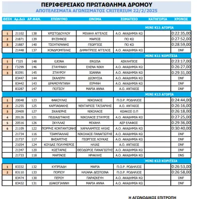 Αναλυτικότερα, στην κατηγορία των «Μίνι Μικρών Αγοριών» (Κ11), ο Χριστοδούλου Μιχαήλ Άγγελος, ο οποίος πρόσφατα βραβεύτηκε ως ο καλύτερος αθλητής στην κατηγορία του στην Ελλάδα στο αγώνισμα του δρόμου για το 2024, ανέβηκε στο υψηλότερο σκαλί του βάθρου, καταγράφοντας τον ταχύτερο χρόνο και πλέον είναι ο πρωταθλητής Δωδεκανήσου για το 2025. Στην ίδια κατηγορία, ο Χονδρομπίλας Δημήτριος Άγγελος σημείωσε τον 4ο ταχύτερο χρόνο ενώ στην αντίστοιχη κατηγορία των κοριτσιών, η Σταυράκη Έλενα Νίκη αναδείχθηκε δευτεραθλήτρια και η Σταύρου Ιωάννα τριταθλήτρια Δωδεκανήσου, σημειώνοντας πολύ γρήγορους χρόνους παρά τους έντονους ανέμους. Στην ίδια κατηγορία, Δραμουντανή Ειρήνη και Σκαλέρη Διονυσία κατέκτησαν την 4η και την 5η θέση, αντίστοιχα.