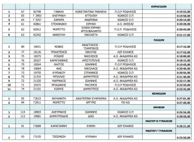 Στην κατηγορία των «Μίνι Μεγάλων Αγοριών (Κ13)», ο Χαράλαμπος Ηλίας Πορρής Κονταντώνης ανέβηκε στο 3ο σκαλί του βάθρου, με τους Παναγιώτη Μακρή, Θεόδωρο Κωσταρά, Ηρακλή Μαρίνο, Γεώργιο Λουκά Βησαρίτη και Νικόλαο Παναγιώτη Τσάμπαλλα, να τον ακολουθούν στην 5η, 6η, 7η, 8η και θέση, αντίστοιχα. Στην κατηγορία των «Μίνι Μεγάλων Κοριτσιών (Κ13)», η Πέρου Παρασκευή ολοκλήρωσε την προσπάθειά της γράφοντας τον 5ο καλύτερο χρόνο στην κατηγορίας της.