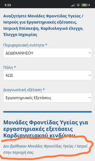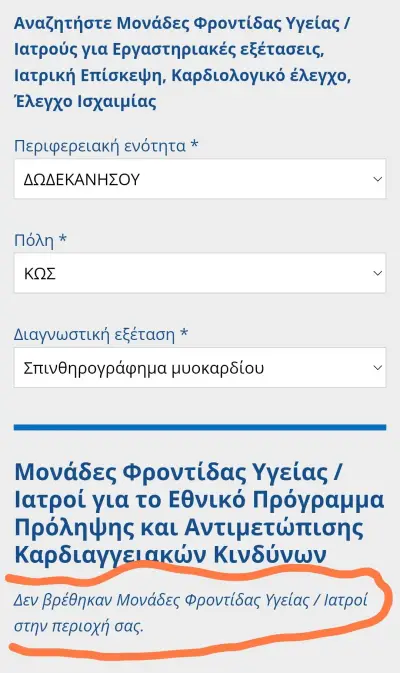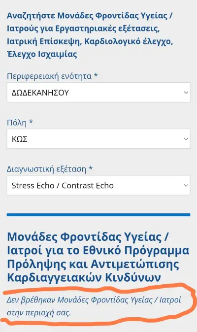 Παραθέτω όλη τη διαδικασία που ακολούθησα μέσω του cardio.gov.gr για να επιβεβαιώσω αυτό που ήδη γνώριζα ... πώς είμαστε πολίτες τρίτης κατηγορίας και μας θυμάστε μόνο στις εκλογές. Ένα θα πω μόνο, ΝΤΡΟΠΗ ΣΕ ΟΛΟΥΣ ΣΑΣ κι ακόμα μεγαλύτερη ΝΤΡΟΠΗ σε όλους όσους ασκούν εξουσία τοπικά και δεν έχουν αποκλείσει το νησί έως ότου έρθει και σε μας η δωρεάν πρωτοβάθμια φροντίδα υγείας.