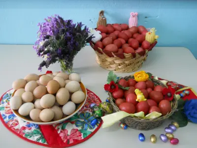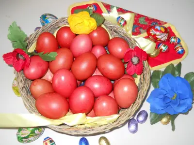 Στη συνέχεια, βάψαμε οικολογικά αυγά με ριζάρι, ένα φυτό που ευδοκιμεί στον τόπο μας με το οποίο έβαφαν παλιά οι γιαγιάδες μας τα αυγά τους το Πάσχα και ήδη άρχισε να ξαναχρησιμοποιείται από πολλές γιατί είναι φυσικό και δεν κάνει κακό στην υγεία μας.