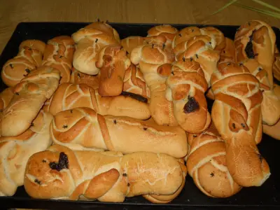 Ακόμη, ζυμώσαμε ζυμάρι για να κάνουμε τα δικά μας λαζαράκια, τους βάλαμε γέμιση και ματάκια από γαρίφαλα.