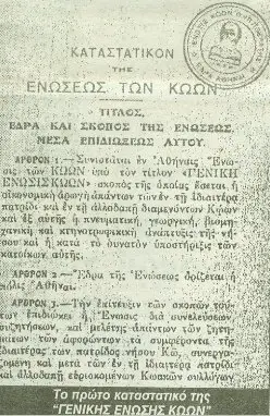 Πριν 90 χρόνια, το 1922, ιδρύθηκε από φλογερούς πατριώτες (οι περισσότεροι από τους οποίους ήταν σπουδαστές, επιστήμονες, επαγγελματίες, βιοτέχνες), η Γενική Ένωση Κώων.Με σιδερένια θέληση, εξόριστοι από την πατρίδα τους, μακριά από το αγαπημένο τους νησί, αλλά στην αγκαλιά της Μητέρας Ελλάδας, άτομα με την ίδια ψυχοσύνθεση, ενωμένοι κάτω από την ίδια ιερή ανάμνηση και με τον πόθο της απελευθέρωσης, απεφάσισαν να φτιάξουν κάτι καινούριο, με σκοπό να δουλέψουν για αυτό που είναι η πιο ιερή ιδέα κάθε πολιτισμένου ανθρώπου: την ΕΛΕΥΘΕΡΙΑ.
