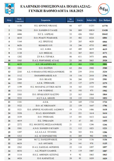 Με την ολοκλήρωση των 2/3 της τρέχουσας αγωνιστικής χρονιάς, η Ελληνική Ομοσπονδία Ποδηλασίας ανακοίνωσε την προσωρινή βαθμολογία των 78 σωματείων που έχουν συμμετάσχει σε αγώνες το 2025.