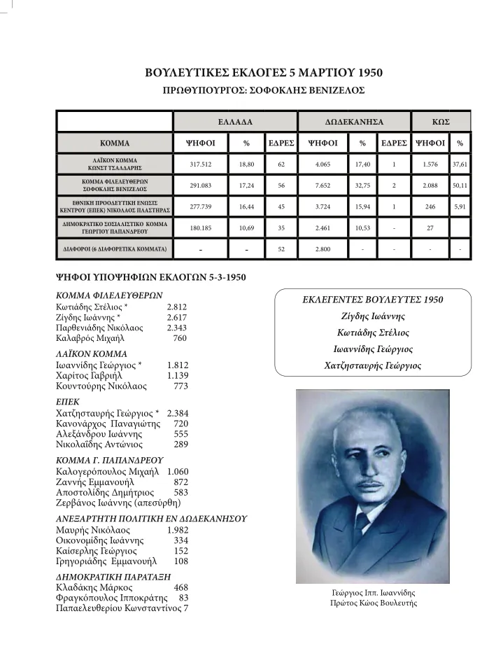 Στο ίδιο κεφάλαιο παρατίθενται ταξινομημένοι πίνακες και φωτογραφίες όλων των Βουλευτών Δωδεκανήσου, Περιφερειαρχών, Νομαρχών Επάρχων, Δημάρχων και Κοινοταρχών της Κω.