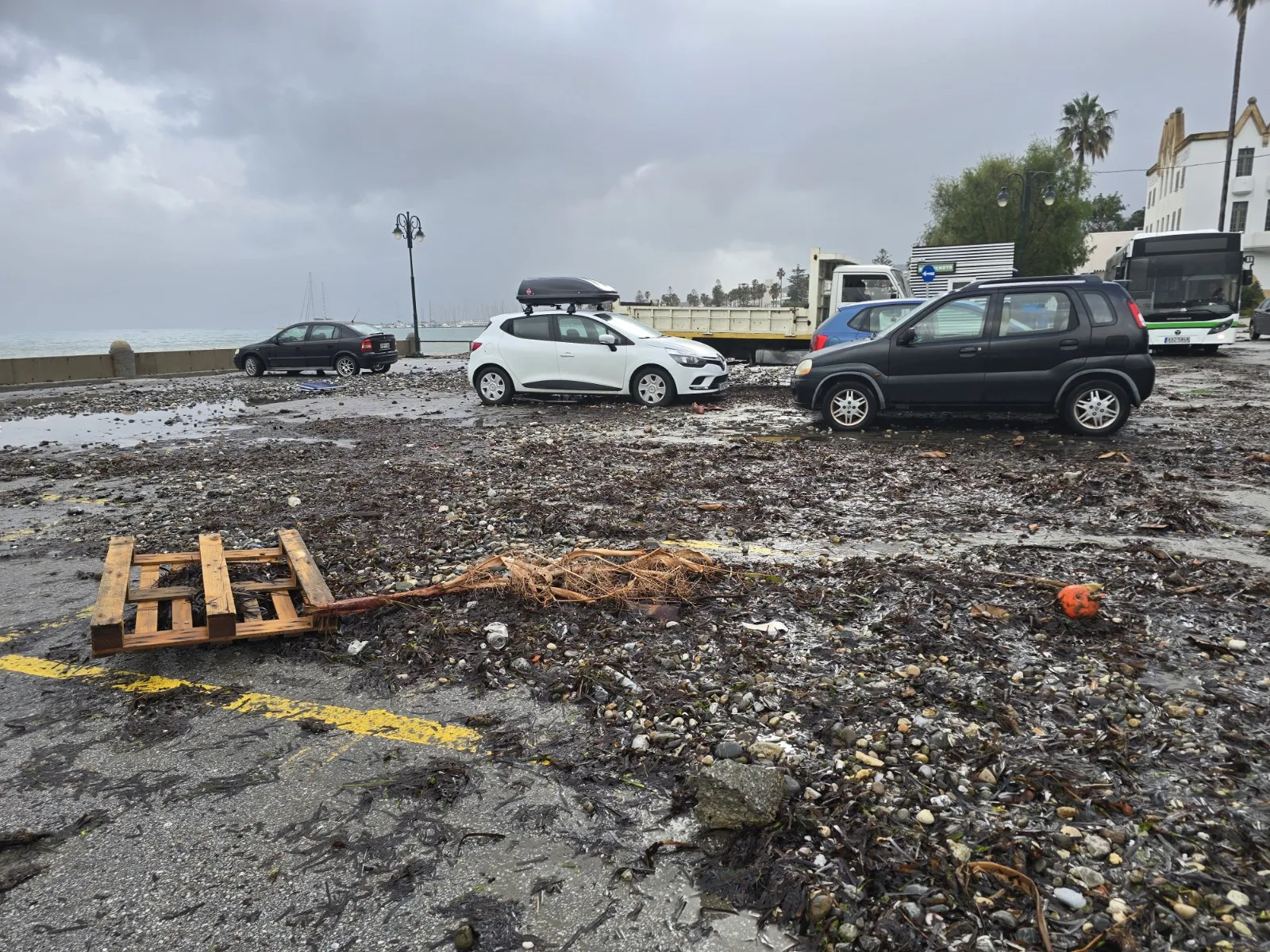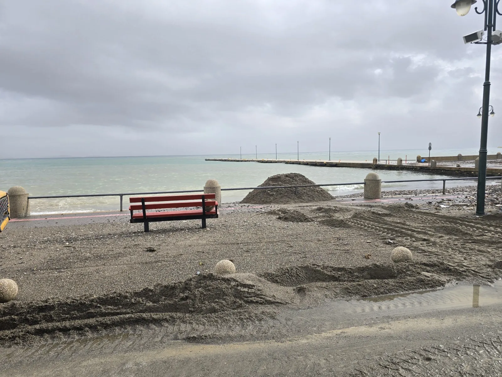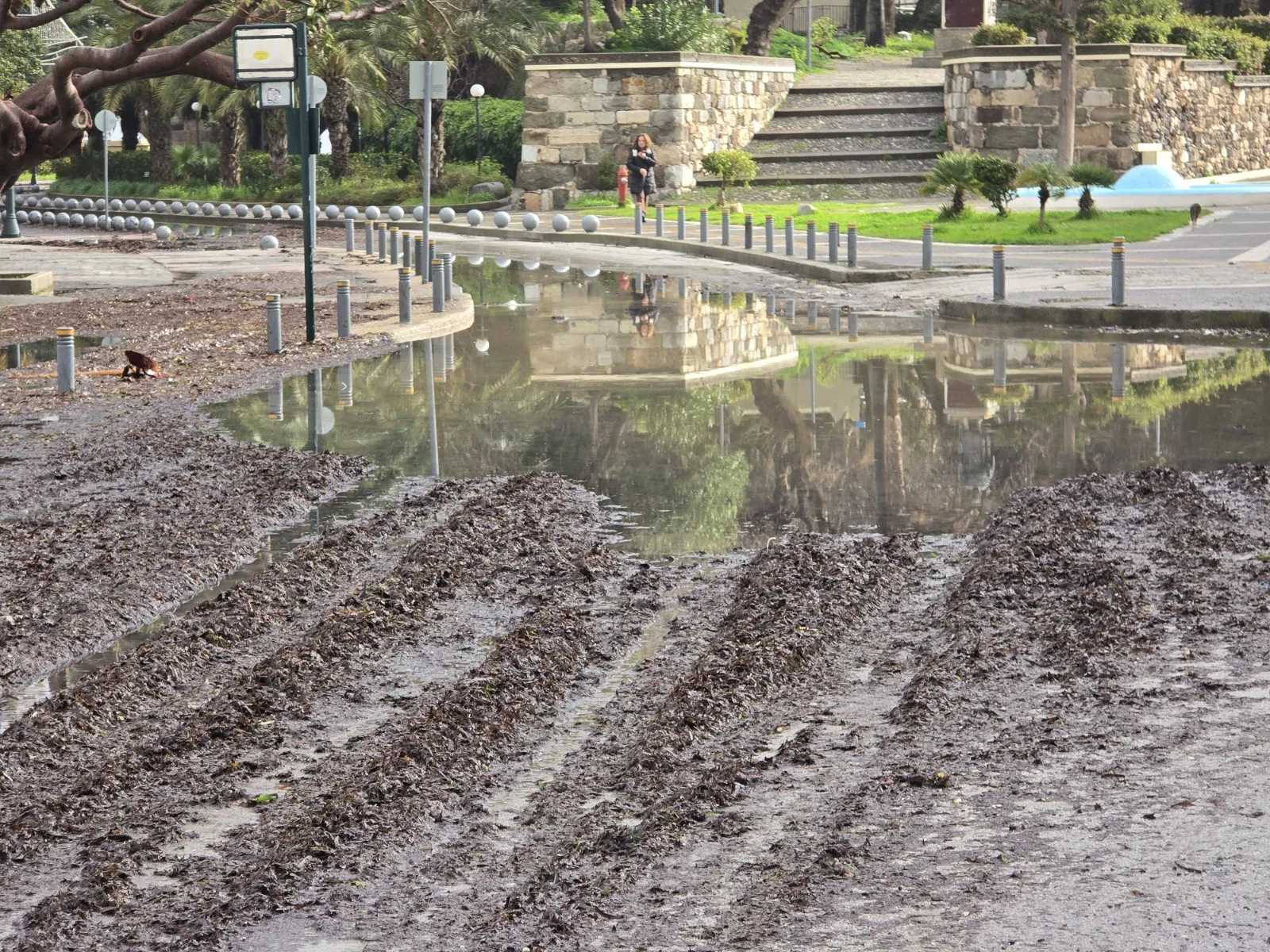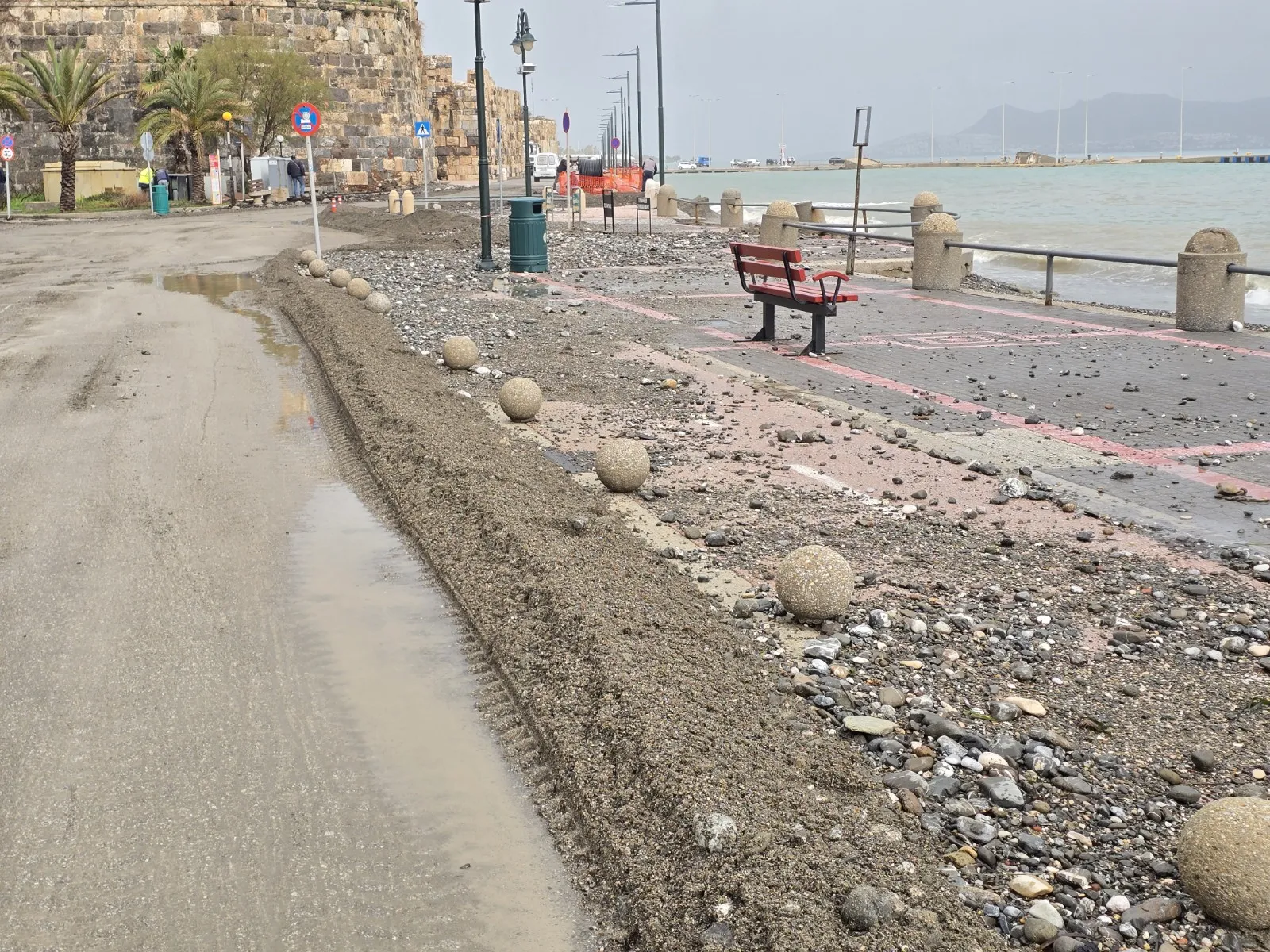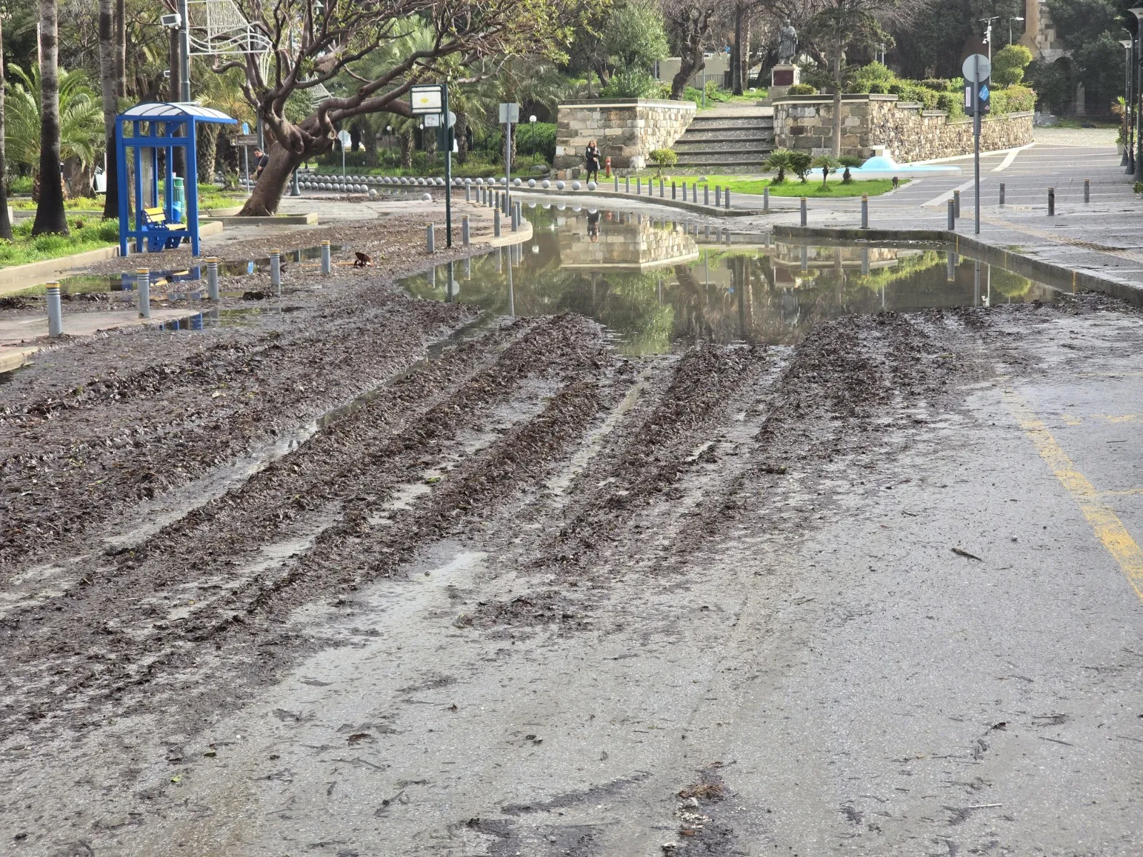 Οι δυνατοί άνεμοι προκάλεσαν εκτεταμένη εισροή θαλασσινού νερού στο οδόστρωμα, με αποτέλεσμα τη μεταφορά μεγάλων ποσοτήτων άμμου, πετρών και φυκιών και τη δημιουργία λιμναζόντων υδάτων σε αρκετά σημεία.