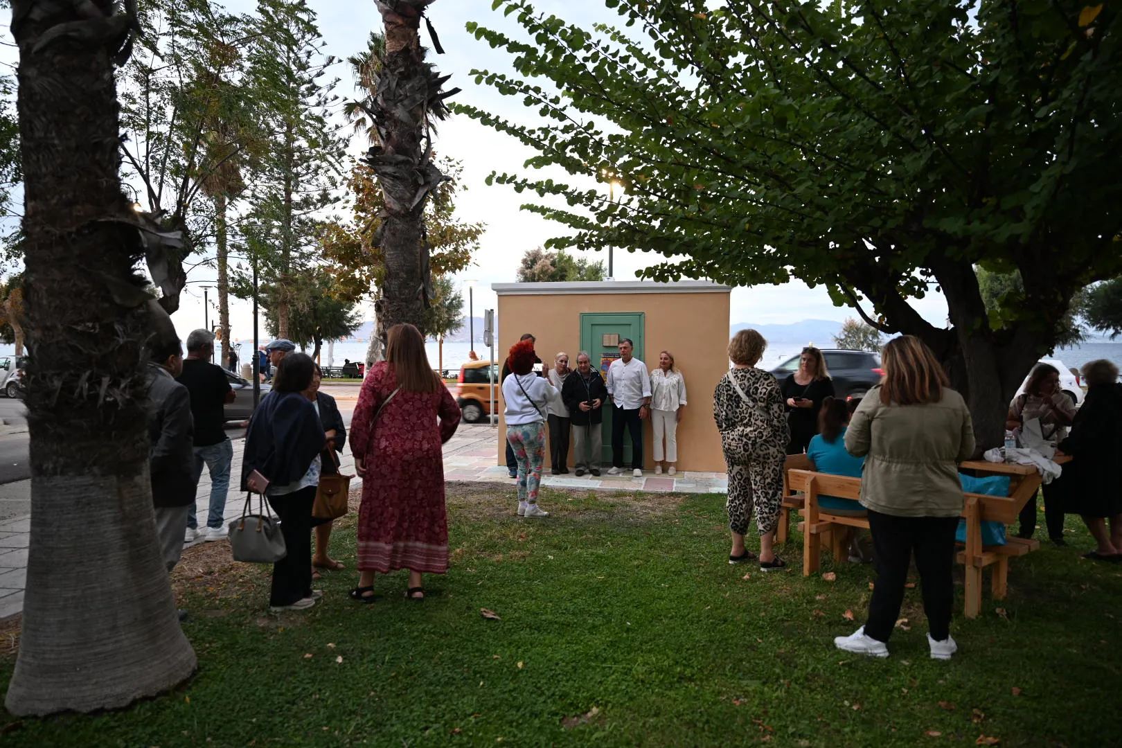 Έξω από τη βιβλιοθήκη έχει διαμορφωθεί ένα φιλόξενο σημείο με παγκάκια και τραπέζι, ώστε όσοι το επιθυμούν να απολαμβάνουν την ανάγνωση με φόντο τη θάλασσα.