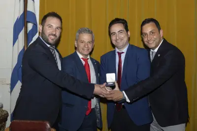 Ο Κυβερνήτης της AHEPA HELLAS κ. Χρήστος Καραπιπέρης μετά τους χαιρετισμούς του Προέδρου του Τμήματος HJ-54 «Ιπποκράτης» (Κως) κ. Αντώνη Γιαννικουρή και του Ιδρυτή & Προέδρου του ΚΕΔΙΣΑ Δρ. Ανδρέα Μπανούτσου, απένειμε αναμνηστική πλακέτα στον Υφυπουργό Εξωτερικών κ. Γιάννη Λοβέρδο.