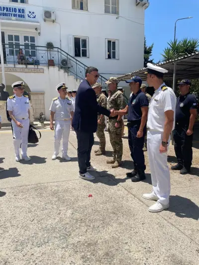 Τον Υπουργό, ο οποίος συνοδευόταν από τον Β’ Υπαρχηγό του Λ.Σ – ΕΛ.ΑΚΤ., Υποναύαρχο Λ.Σ. Φώτιο Κιάμο, υποδέχθηκαν ο Διοικητής της 8ης Περιφερειακής Διοίκησης Λ.Σ. – ΕΛ.ΑΚΤ., Πλοίαρχος Λ.Σ. Δημήτριος Ζαραζάνης, ο Λιμενάρχης του Λιμεναρχείου Κω, Πλοίαρχος Λ.Σ. Ιωάννης Μάργαρης και ο Πρόεδρος της Μαρίνας Κω, Ιωάννης Καλλέργης, με τους οποίους μετέβη, αρχικά, για επιθεώρηση στα περιπολικά σκάφη του Λ.Σ-ΕΛ.ΑΚΤ. που ελλιμενίζονται στη Μαρίνα. Εκεί, συνεχάρη τα πληρώματα για την διαρκή ετοιμότητα, τον επαγγελματισμό και την αυταπάρνηση που επιδεικνύουν καθημερινά, με γνώμονα την προστασία της ανθρώπινης ζωής στη θάλασσα και την προάσπιση των θαλασσίων συνόρων της πατρίδας.