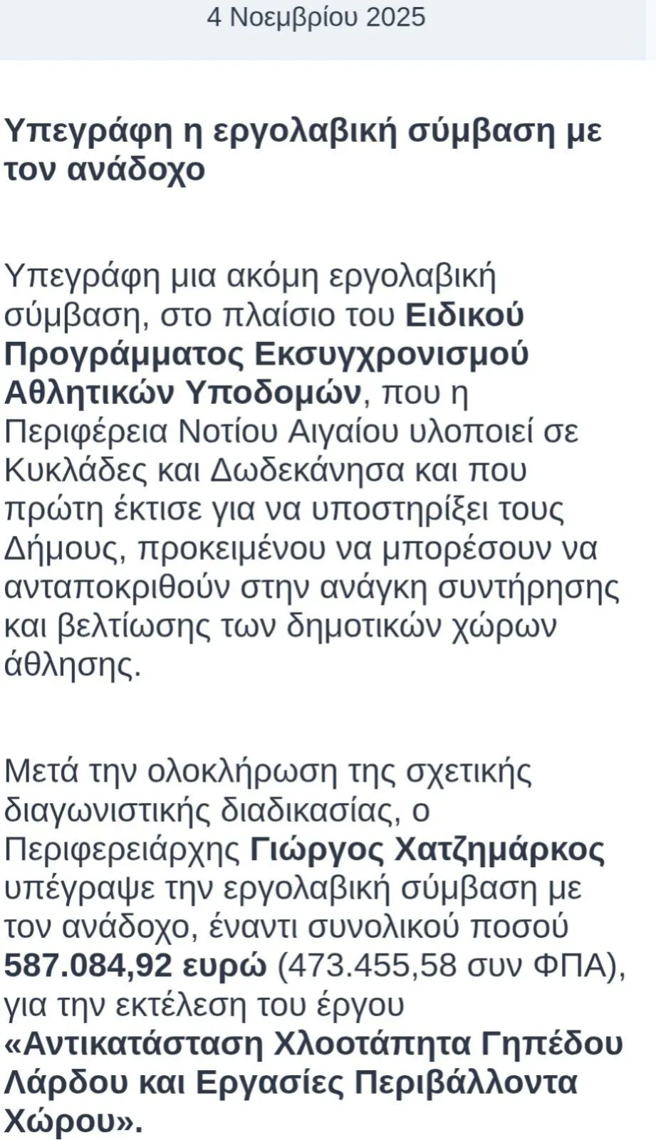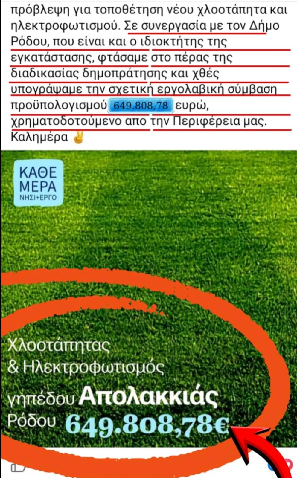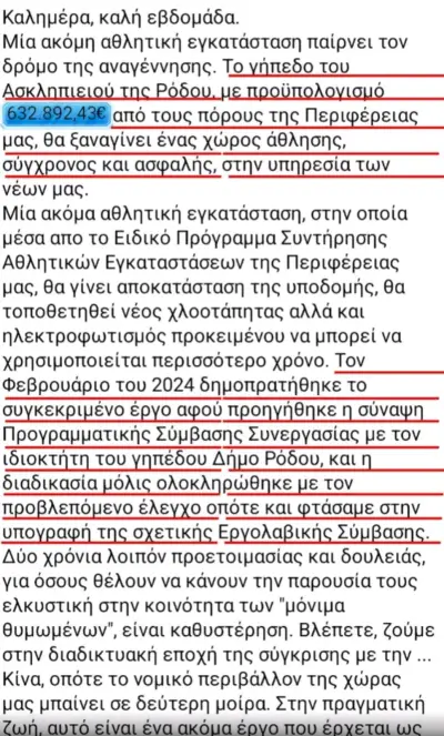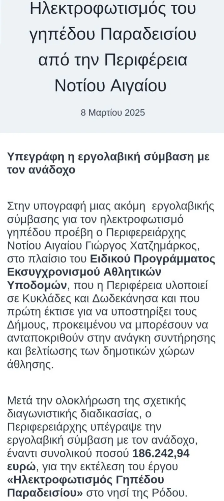 Με αυτόν τον τρόπο άλλωστε, η Περιφέρεια Νοτίου Αιγαίου χρηματοδότησε, εφέτος, έργα στα δημοτικά γήπεδα ποδοσφαίρου, όπως της Απολακκιάς, του Ασκληπιείου, της Λάρδου και του Παραδεισίου, συνολικού προϋπολογισμού 2.056.029,07€.