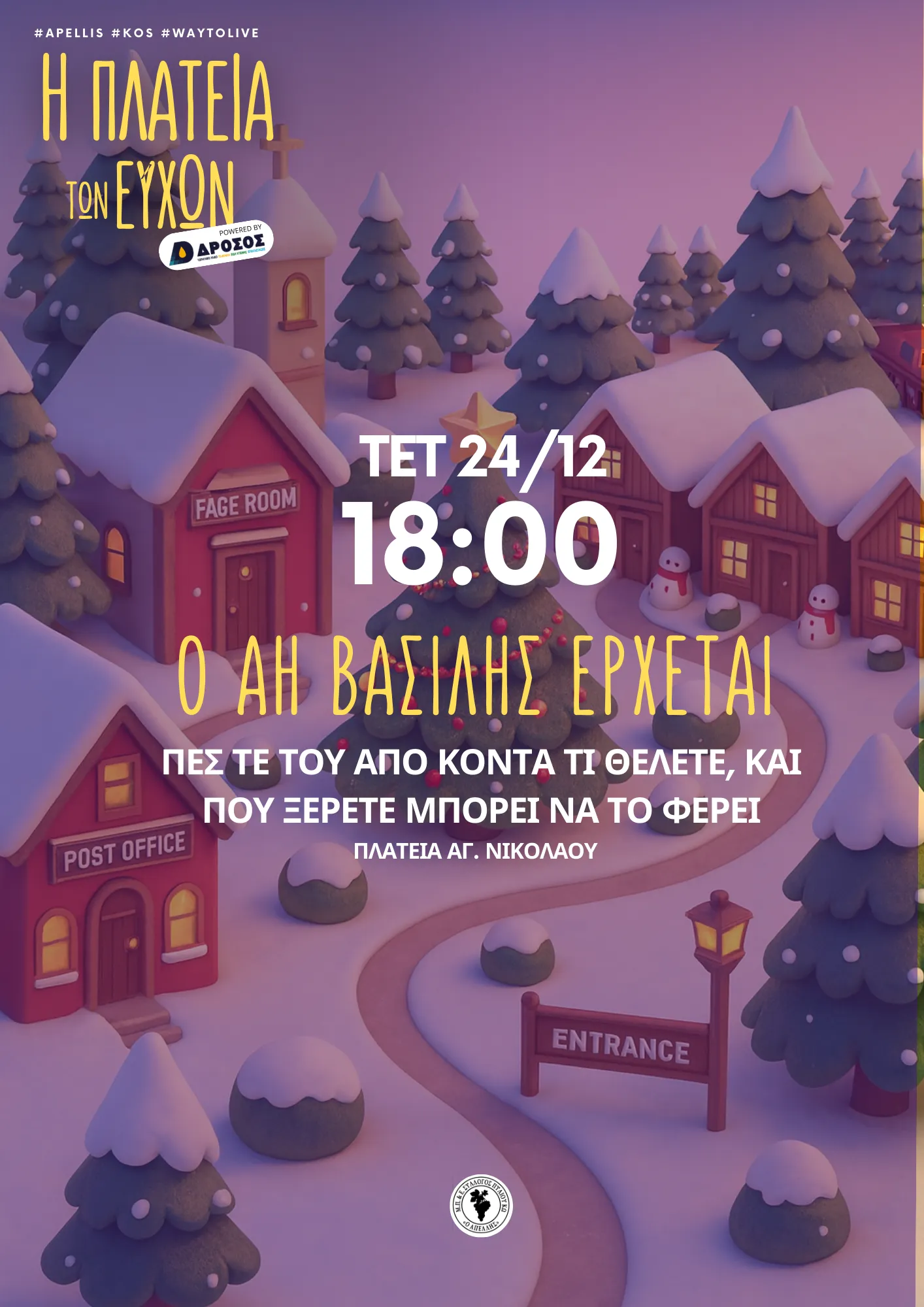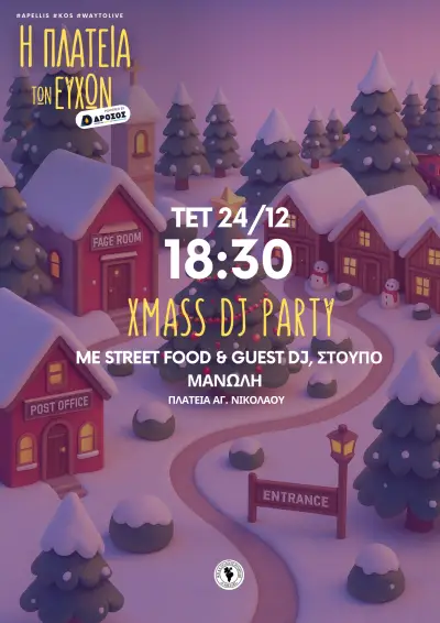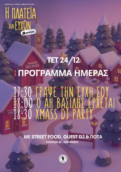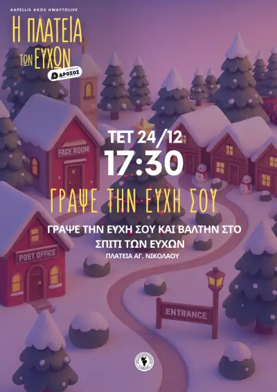 Το μικρό χριστουγεννιάτικο χωριό στο Πυλί, “Πλατεία των Ευχών”, έχει ανοίξει τις πύλες του για πρώτη φορά στην Κω, σε έναν χώρο φτιαγμένο με μεράκι και πολύ φως. Στην πλατεία ο επισκέπτης μπορεί να βρει το σπίτι του Άη Βασίλη, το Σπιτάκι των Ευχών, όπου μπορεί να γράψει τις ευχές του για το νέο έτος, καθώς και το Δέντρο των Ευχών, στο οποίο οι επισκέπτες μπορούν να αφήσουν τις ευχές τους.